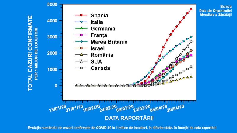 Este un grafic care ne permite comparații directe între statele care ne interesează, arată numărul de bolnavi dintr-un milion de locuitori. Se observă că am ajuns la diferențe foarte mari între diferite state. Sus, regretabil, Spania, cu aproape 5.000 de spanioli dintr-un milon de locuitori sunt coronapozitivi. În italia avem sub 3000. Avem date foarte apropiate de Italia și în SUA.