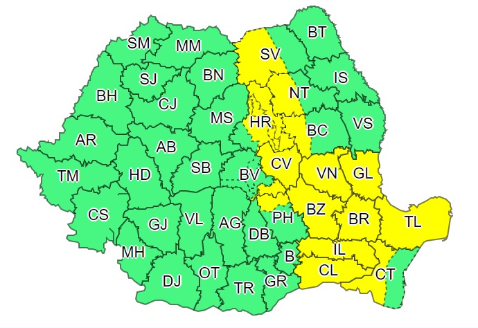 Codul galben va intra în vigoare astăzi, la ora 12:00 și este valabil până diseară la ora 20:00.