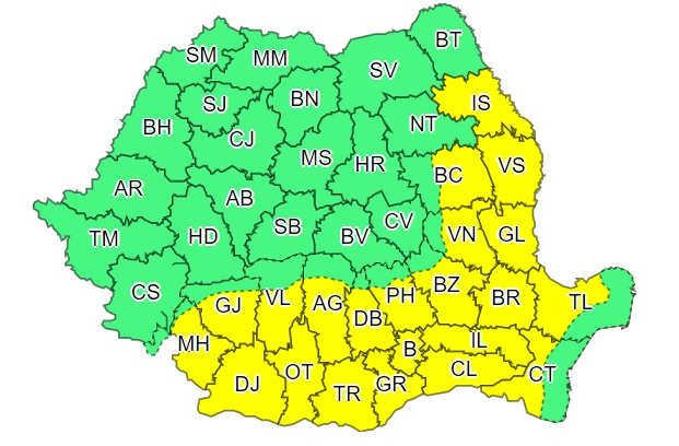 Administrația Națională de Meteorologie (ANM) a emis patru avertizări cod galben și portocaliu, astfel că România este împărțită între zonele cu caniculă și cele care se pregătesc de vreme rea.