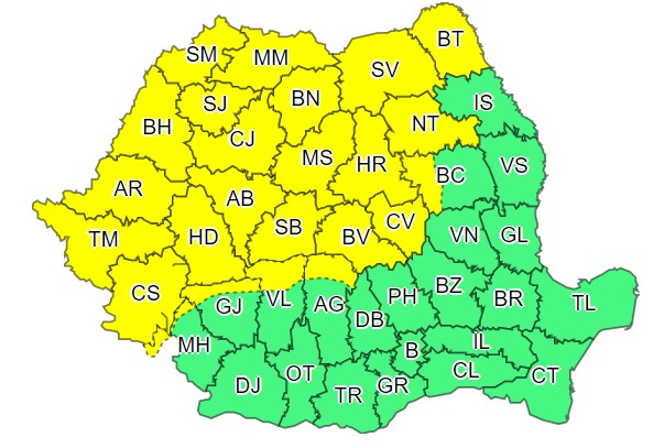 În Banat, Crișana, Maramureș, local în Transilvania și în vestul Carpaților Meridionali, vor fi perioade cu instabilitate atmosferică accentuată, ce se va manifesta prin frecvente descărcări electrice, averse torențiale, grindină și vijelii. Cantitățile de apă vor depăși 25-30 l/mp și pe arii restrânse 40-50 l/mp.