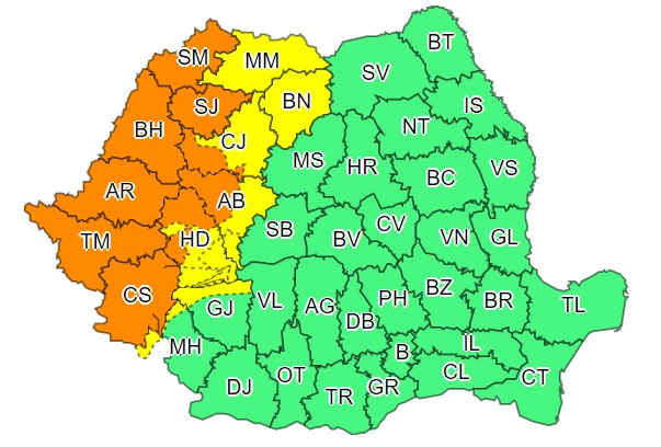 În județele Timiș, Arad, Bihor, Satu Mare, Sălaj, Caraș Severin, precum și în zona de munte a județelor Hunedoara, Alba și Cluj vor fi intervale cu intensificări puternice ale vântului (rafale de 80-90 km/h), vijelii, frecvente descărcări electrice și grindină.Pe arii restrânse vor fi averse torențiale și se vor acumula cantități de apă de peste 35-60 l/mp.