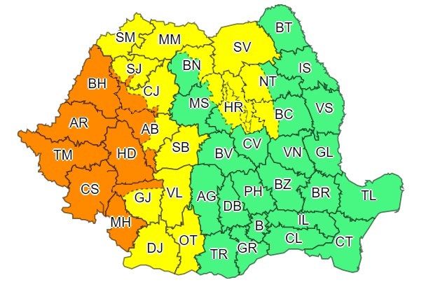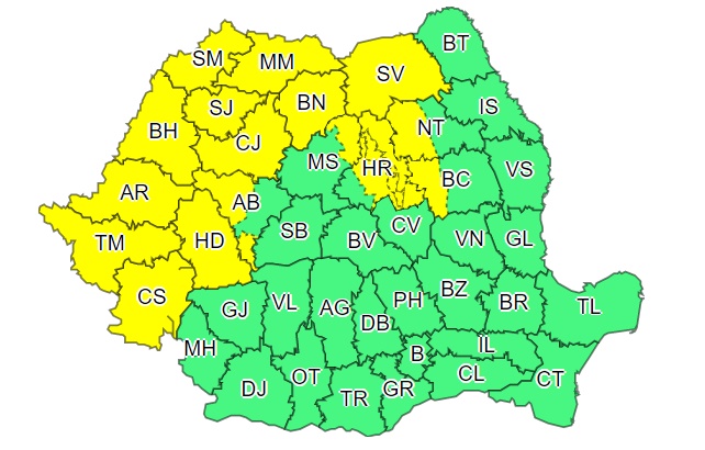 Județele vizate de Codul galben sunt: Alba, Arad, Bacău, Bihor, Bistrița-Năsăud, Cluj, Caraș-Severin, Hunedoara, Harghita, Maramureș, Mureș, Neamț, Sălaj, Satu Mare, Suceava și Timiș.