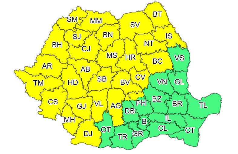 Administrația Națională de Meteorologie (ANM) a emis o atenționare Cod galben de instabilitate atmosferică accentuată, cantități însemnate de apă și intensificări ale vântului.