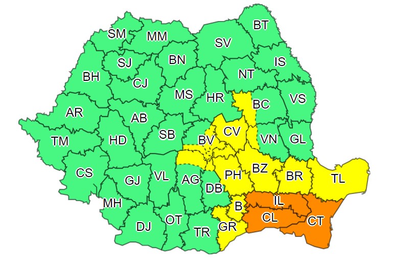 Județele vizate de avertizarea Cod galben sunt: Argeș, Bacău, Brașov, Covasna, Giurgiu, Prahova, Vrancea, București, Brăila, Buzău, Dâmbovița și Tulcea.