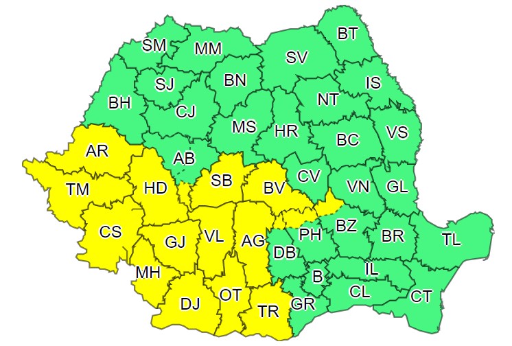 Administrația Națională de Meteorologie (ANM) a emis două atenționări Cod galben de ploi torențiale și vijelii, în aproape toată țara.