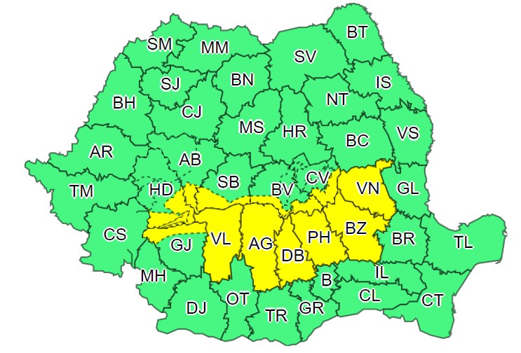 Județele vizate de Codurile galbene sunt: Alba, Brașov, Covasna, Gorj, Prahova, Vâlcea, Argel, Buzău, Dâmbovița, Hunedoara, Sibiu și Vrancea.