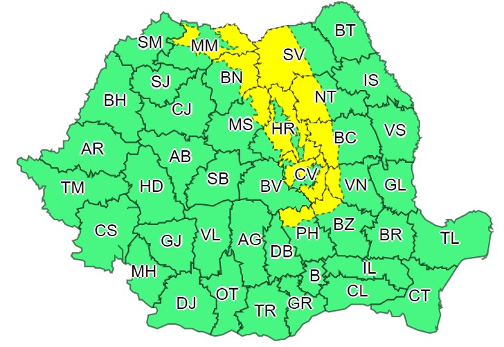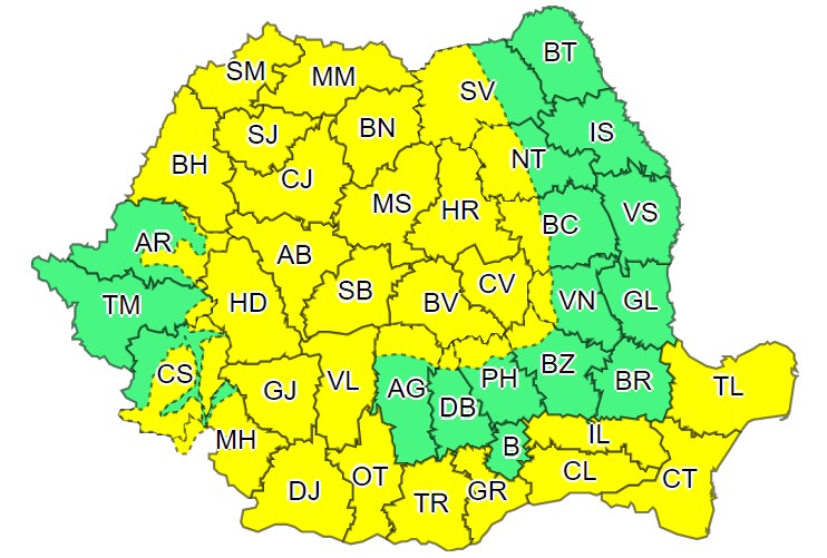 Prima atenționare Cod galben a intrat în vigoare luni, la ora 10:00, și este valabilă până diseară, la ora 19:00.