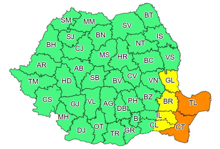 Județele vizate de atenționarea Cod portocaliu sunt Constanța și Tulcea.