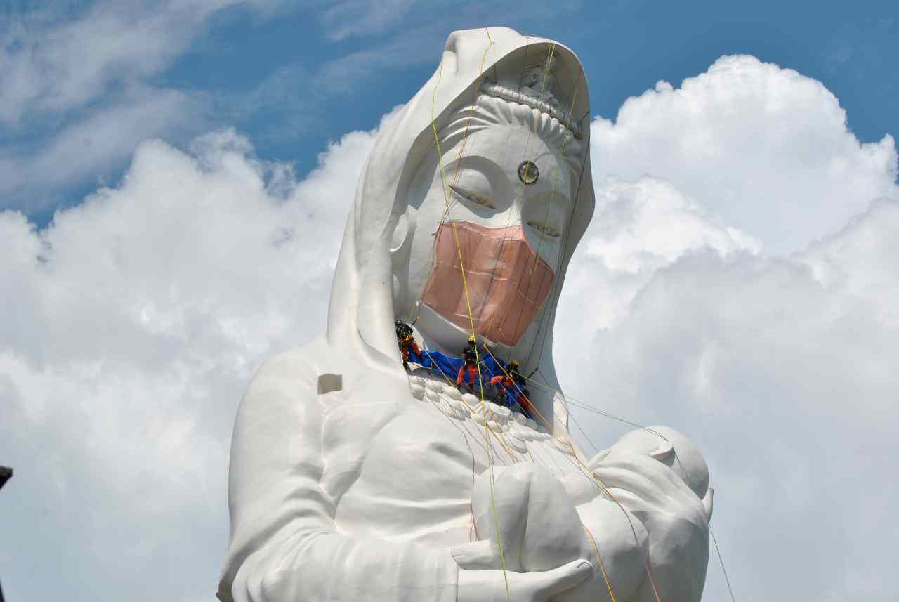O echipă de muncitori a escaladat marţi o statuie imensă a unei zeiţe budiste din Japonia pentru a instala o mască facială confecţionată special, demers menit să fie o rugăciune pentru finalul pandemiei de coronavirus, informează Reuters.