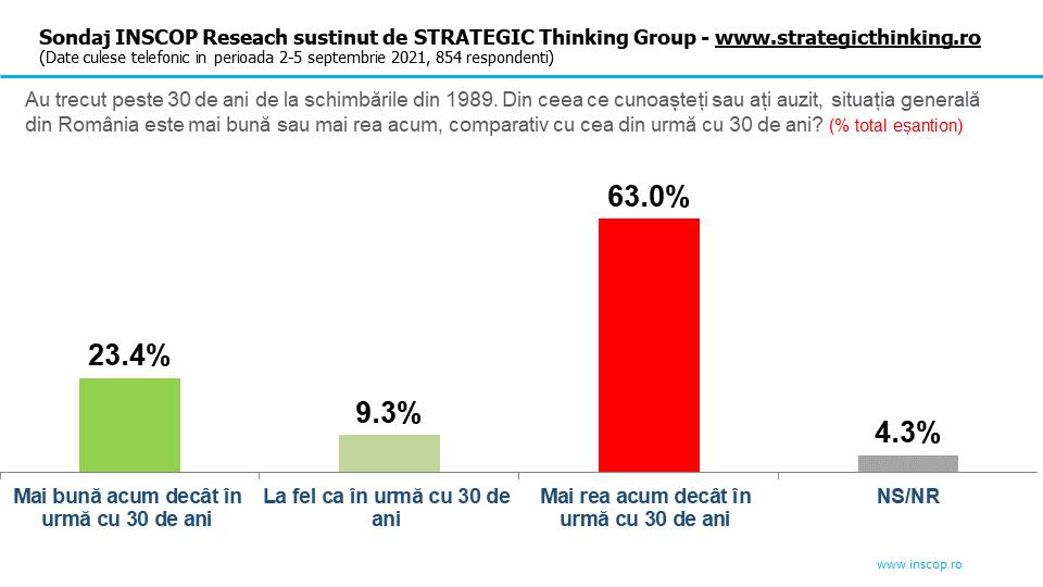 Cercetarea relevă că aproape două treimi dintre români (63%) cred că situația generală din România este mai rea comparativ cu cea din urmă cu 30 de ani. Un alt sondaj Inscop, realizat în urmă cu șapte ani, arăta că 40% dintre români erau de părere că situația e mai rea decât în trecut.