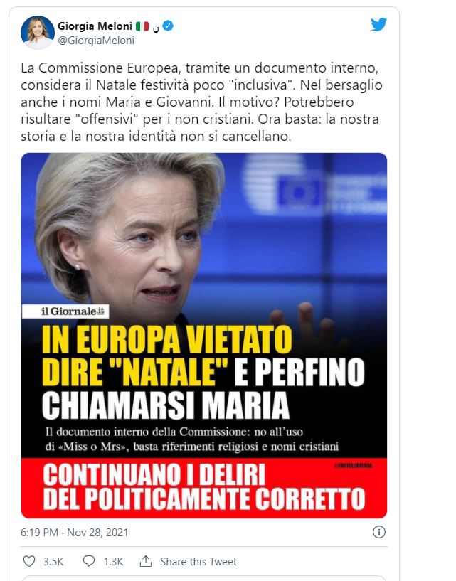 Schimbările de exprimare propuse de Comisia Europeană sunt blamate de liderul formațiunii Fratelli d'Italia, Giorgia Meloni, care scrie pe Twitter: „Comisia Europeană, printr-un document intern, consideră Crăciunul o sărbătoare neincluzivă. Numele Maria și Giovanni sunt și ele vizate. Motivul? Ar putea fi „ofensatoare” pentru necreștini. Gata, acum e deja prea mult: ne sunt şterse istoria și identitatea".