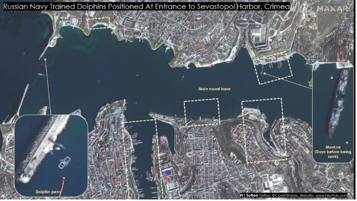 Imagini din satelit arată că rușii au instalat două cuști într-un golf în care țin mamiferele, pentru a păzi portul din Sevastopol. Acestea au fost aduse acolo în februarie, în zilele premergătoare războiului. Mamiferele au rolul de a proteja navele rusești de posibile atacuri ale trupelor speciale ucrainene care ar încerca acțiuni de sabotaj cu ajutorul scafandrilor.