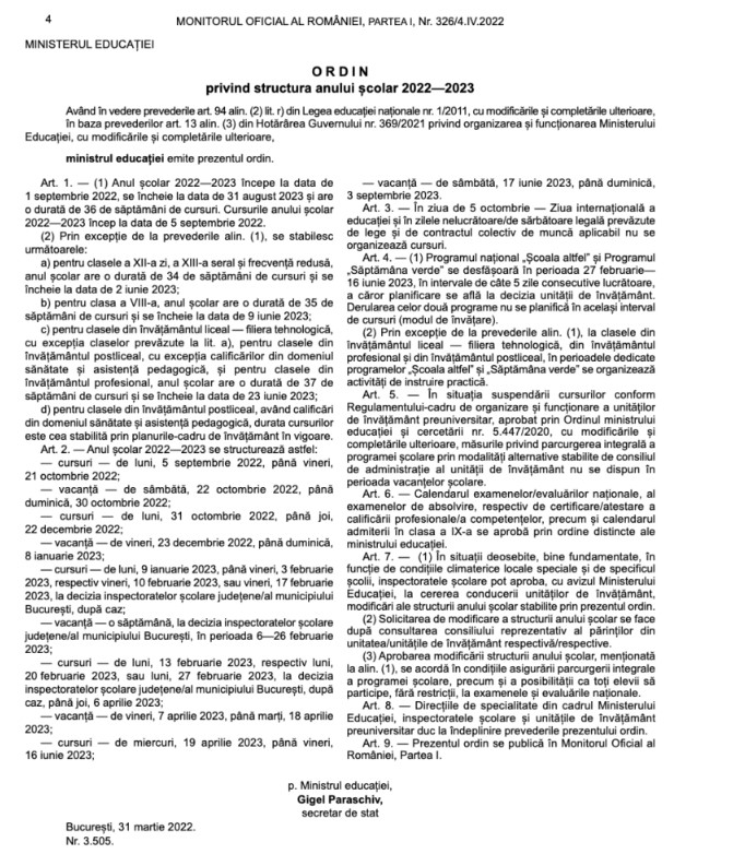 Totodată, este pentru prima dată când este menționată în ordinul de ministru din acest an, pentru anul școlar 2022 - 2023, și data de terminare a vacanței de vară, anume 3 septembrie 2023, cât și data de început a cursurilor pentru viitorul an școlar, adică 4 septembrie 2023.