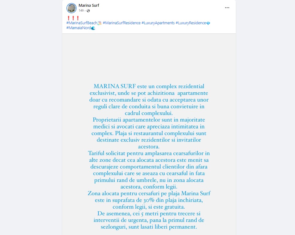 „Este o satiră la ce se întâmplă în România, este soluţia cea mai elegantă pe care am găsit-o în momentul de faţă. Întreaga idee este să descurajăm pe cei care vor să vină din afara complexului cu cearşaful, manele, bere şi seminţe. Noi avem un complex care este la un alt nivel faţă de ceea ce există în ţară. Avem proprietari aici care au plătit un preţ exclusivist şi beneficiază de nişte condiţii pe măsură. (...) De zece ani avem problema celor care vin din afară cu cearşaful şi se pun oriunde. Pe noi nu ne ascultă nimeni. Trebuie să ne certăm cu ei, să-i ridicăm de acolo. Acest tarif (200 de lei n.red.) s-a creat din două motive: avem persoane exclusiviste care vor să stea mai aproape de natură, nu vor să stea pe şezlong, ci pe cearşaf şi avem persoane care trebuie descurajate. În afară de cei din complex, nu a fost niciun client care să plătească pentru a sta la cearşaf, a declarat reprezentantul companiei private, pentru adevărul.ro.