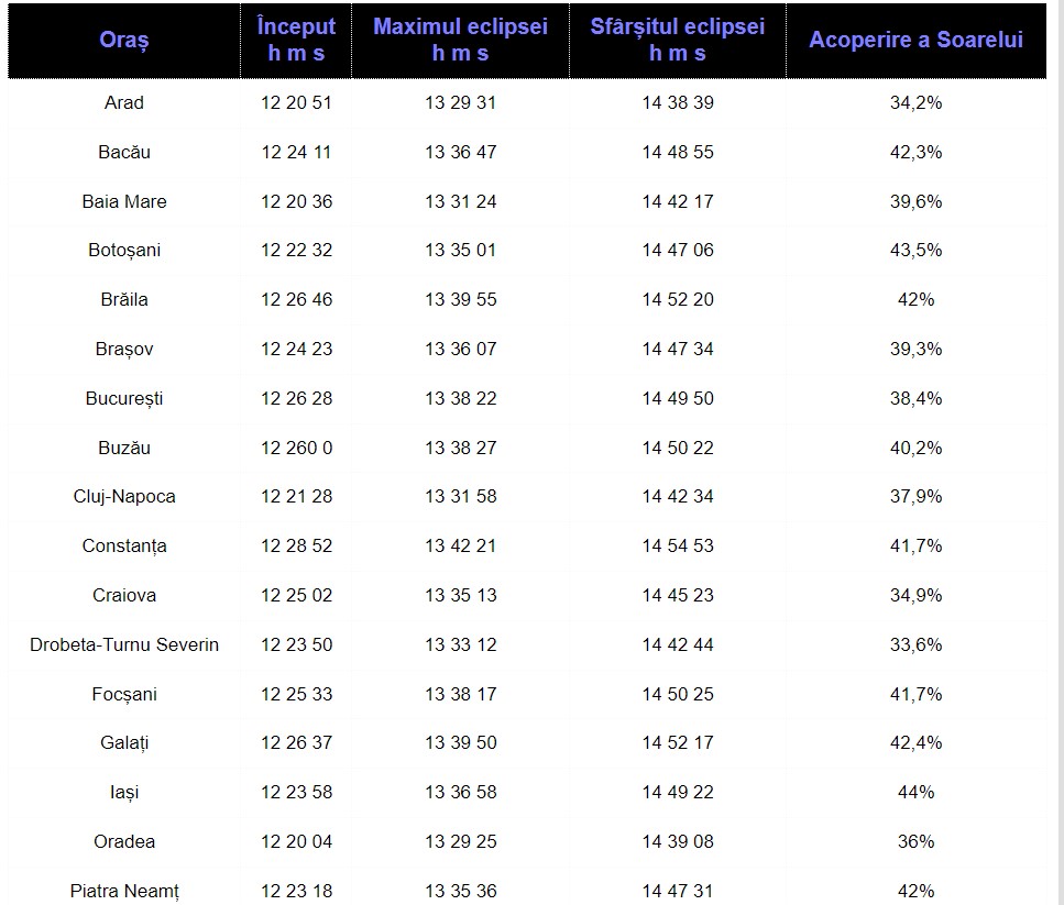 Intervalele orare la care se produce eclipsa de Soare în orașele țării