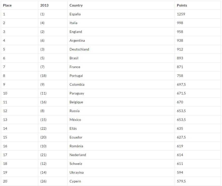 Cel mai puternic campionat este cel al Spaniei, cu 1259 puncte, urmat de cele din Italia (998) si Anglia (958).