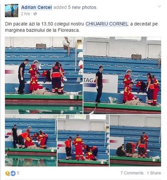 "Din pacate, astazi, la 13:50, colegul nostru Chiuariu Cornel a decedat pe marginea bazinului Floreasca", a scris pe Facebook, Adrian Cercel.