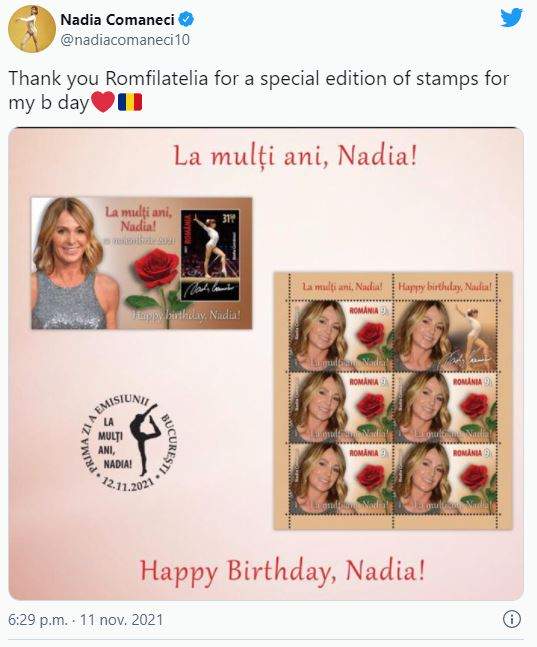 Gimnasta a fost impresionată de cadoul primit din partea Romfilatelia, societatea eminentă a timbrelor și efectelor poștale românești. Vineri, instituția a emis o ediție specială de timbre, cu un mesaj aniversar pentru campioana noastră.