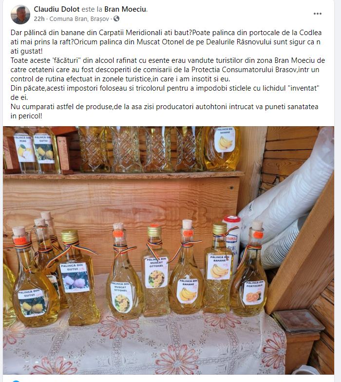 Președintele Autorității Naționale pentru Protecția Consumatorului (ANPC), Claudiu Dolot, a transmis consumatorilor, într-o postare pe contul personal de Facebook, să nu cumpere multiplele sortimente de palincă vândute de comercianții din zona Bran-Moieciu, acestea fiind „făcături” din alcool rafinat cu esențe. Recent, inspectorii au descoperit, în urma unui control, un bărbat care vindea palincă din portocale și din banane, pe care o vindea ca „produs specific”. Individului i-a fost confiscată marfa și s-a ales cu o amendă. De asemenea, pe numele său poate fi deschis și un dosar penal.