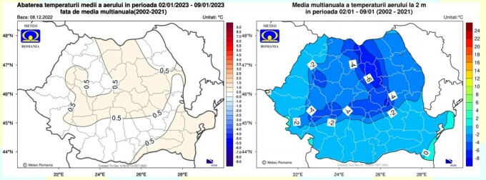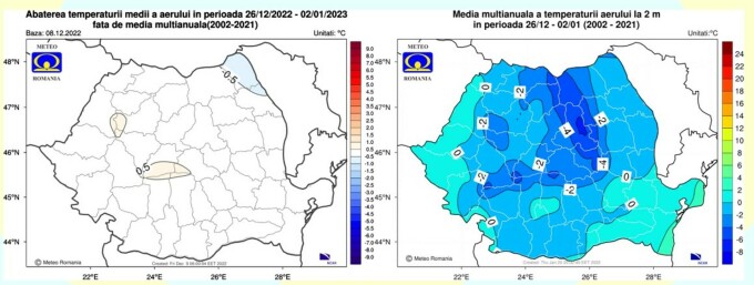 Mediile în România vor fi sub pragul înghețului. Numai pe litoral va fi o excepție, înregistrându-se o medie în jur de 2 grade Celsius. În zona Carpaților Orientali și a depresiunilor se vor înregistra temperaturi medii de -6 grade Celsius, în vreme ce în stațiunile montane din Meridionali și Apuseni vor fi aproape -4 grade Celsius.