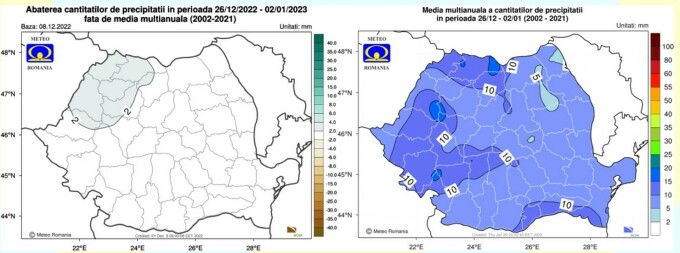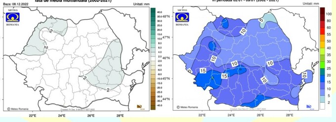 Transilvania și Moldova vor avea valori în jur de -2 grade Celsius, iar în restul țării media va fi între -1 și 0 grade Celsius. Cât despre precipitații, specialiștii meteo anunță că vor fi apropiate de cele normale pentru acest interval, în toate regiunile, potrivit prognozei ANM.