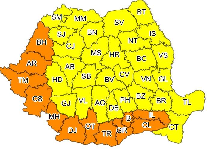 O avertizare cod portocaliu de caniculă și disconfort termic accentuat va fi valabilă vineri, în București și 11 județe din țară. Conform ANM, canicula se va intensifica în Crișana și Banat, unde vor fi 37...39 de grade Celsius, cât și în jumătatea de sud a Olteniei și a Munteniei unde vor fi temperaturi maxime de 39...41 de grade Celsius.
