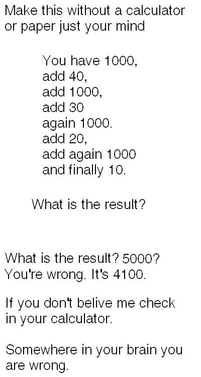 Tot ce trebuie sa faci este sa aduni opt numere pentru a afla rezultatul socotelii. Cat de greu poate fi? Eh, bine, dintr-un motiv sau altul, foarte multe persoane gresesc si, in loc de 4100 obtin 5000.