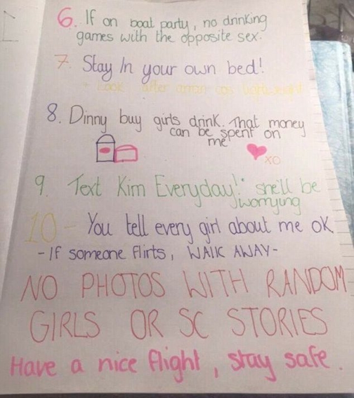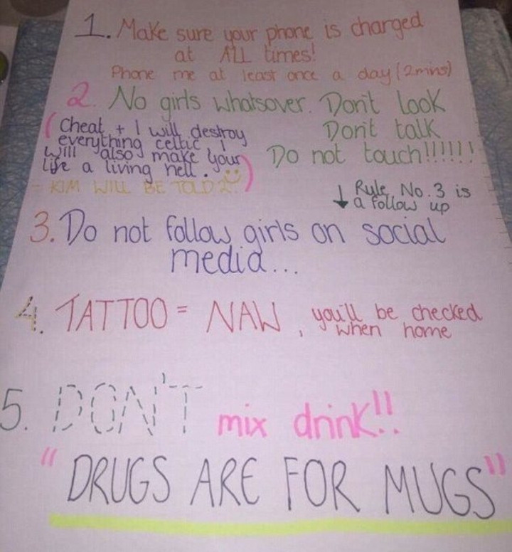 Kieran Lumsden, din Edinburgh, a postat de curand lista cu reguli pe care prietena sa a scris-o inainte ca acesta sa plece in vacanta cu baietii. Iata cateva dintre reguli: