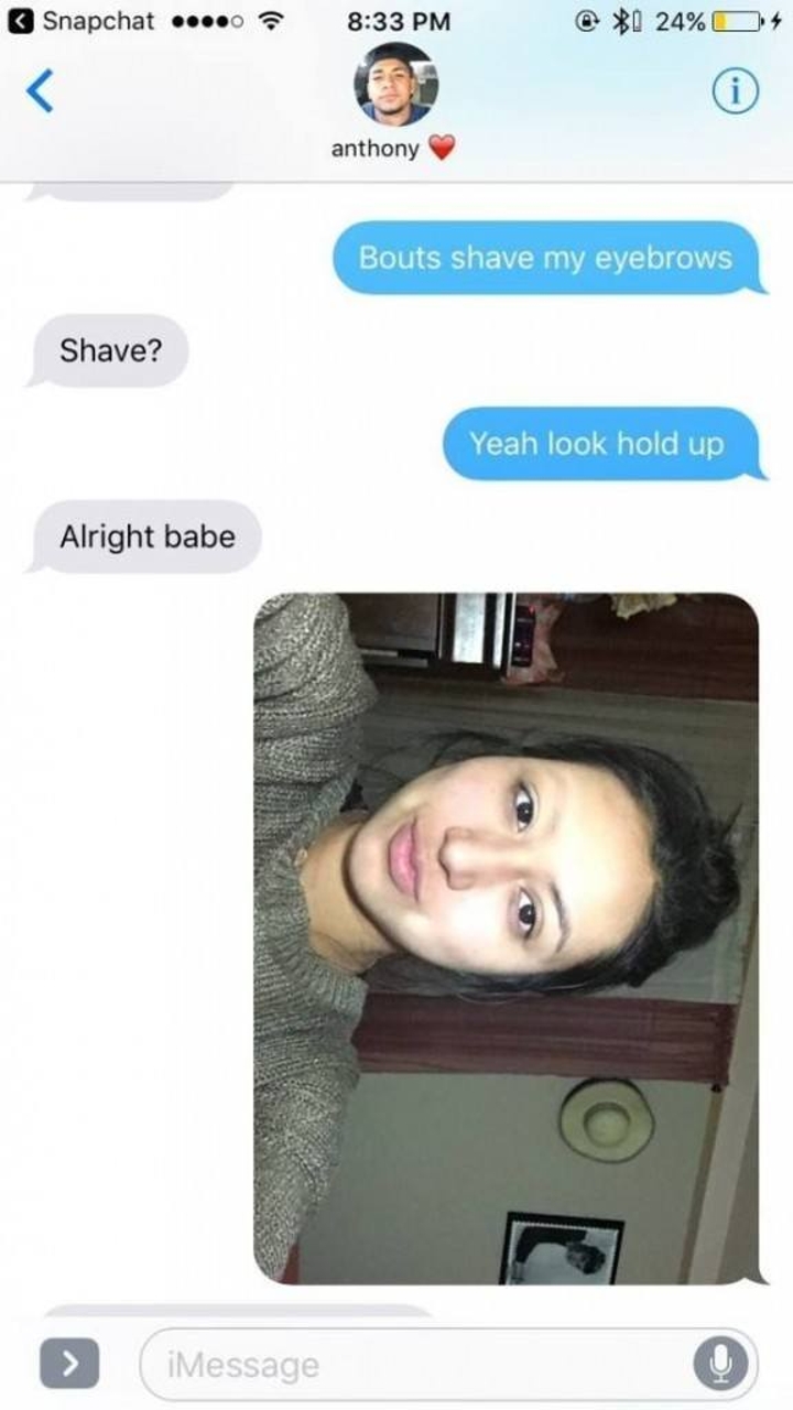 Tanara a folosit diferite produse de machiaj pentru a-si acoperi sprancele astfel incat sa para ca le-a ras. Apoi i-a trimit un mesaj si cateva poze iubitului in care il anunta de marea decizie. Acestuia nu i-a venit sa creada ca iubita lui a fost in stare sa faca asa ceva.