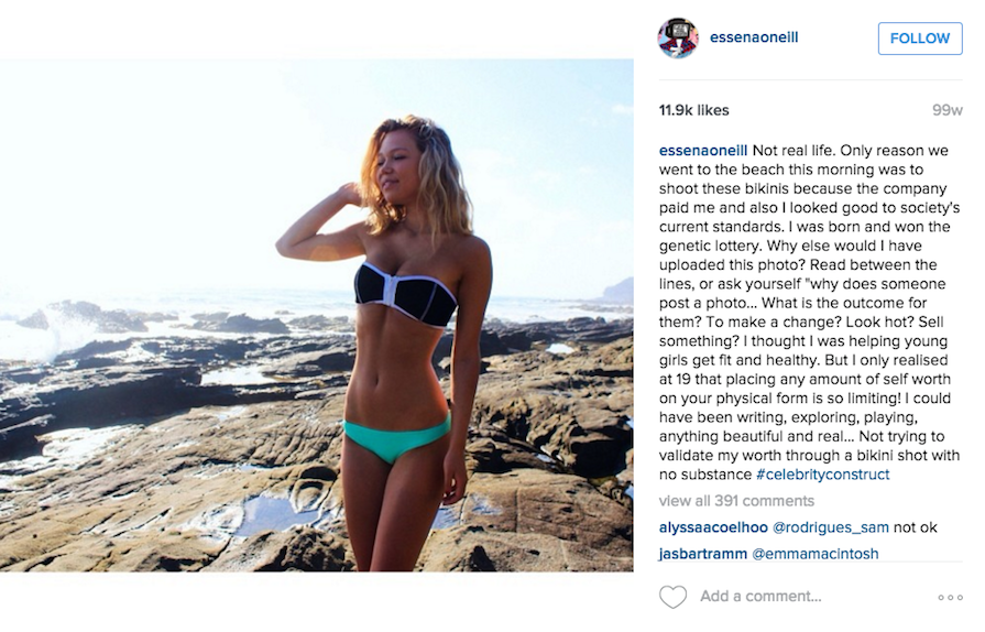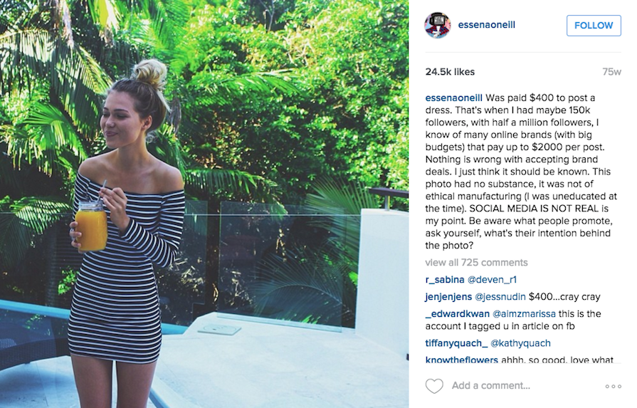 „Am fost platita 400 de dolari pentru a ma fotografia in aceasta rochie. Asta se intampla cand aveam 150,000 de fani. Nu este rau sa accepti bani de la branduri. Dar, cred ca acest lucru ar trebui stiut. (...) Social media nu este reala. Fiti atenti la ce promoveaza oamenii si intrebati-va care este intentia din spatele fotografiilor,” a scris O’Neill in dreptul unei fotografii.