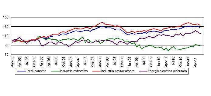- In luna iunie 2011, productia industriala (serie bruta), a scazut fata de luna precedenta cu 1,5%, din cauza scaderii tuturor sectoarelor industriale: