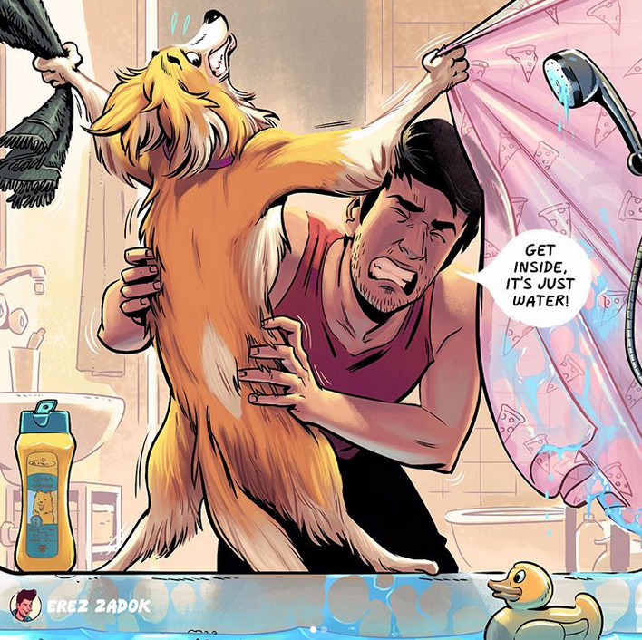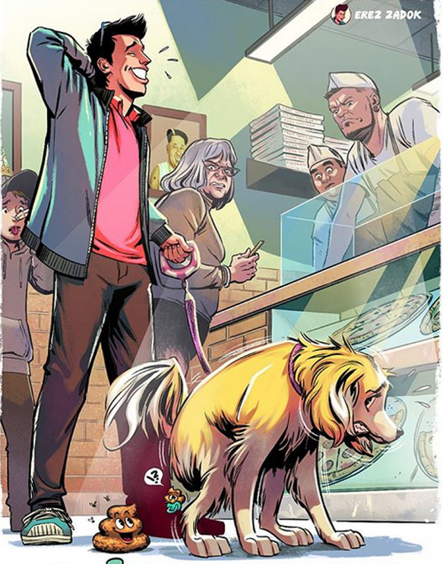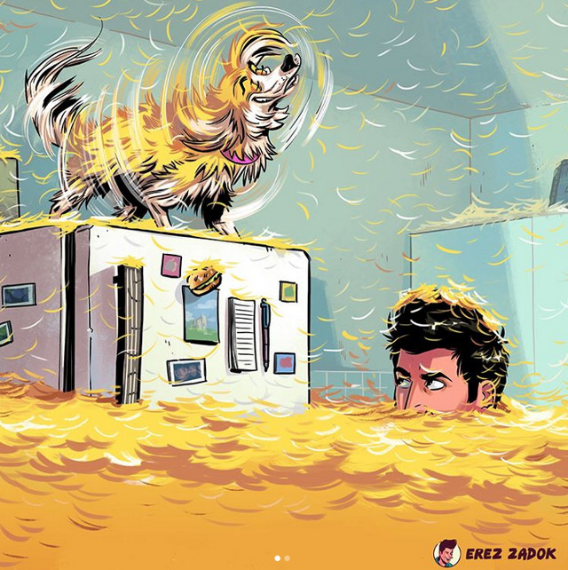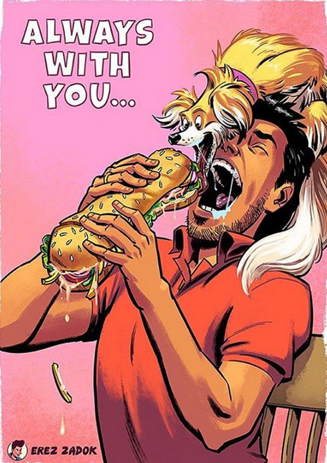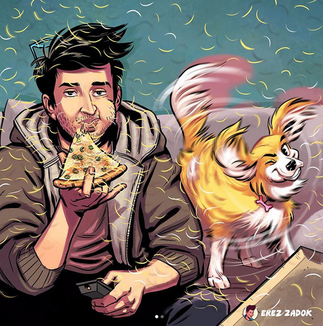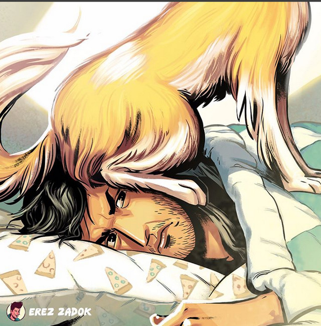Dupa ce am vazut cum e viata alaturi de o pisica, este cazul sa acordam aceeasi atentie si persoanelor care au un caine (sau mai multi). Pentru mai multe imagini asemanatoare, puteti intra pe pagina de Instagram a artistului Erez Zadok, cel care a creat imaginile de mai jos.
