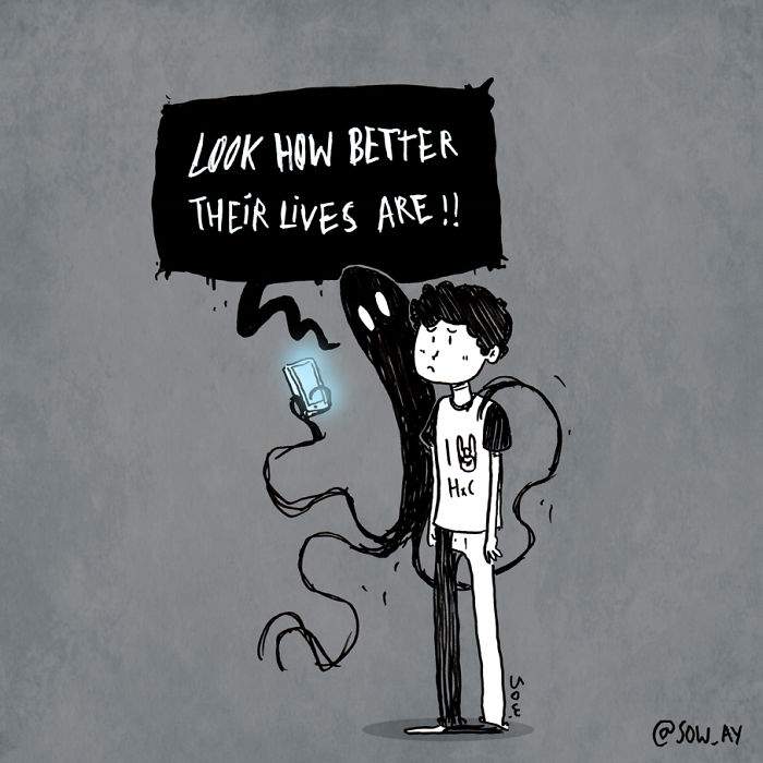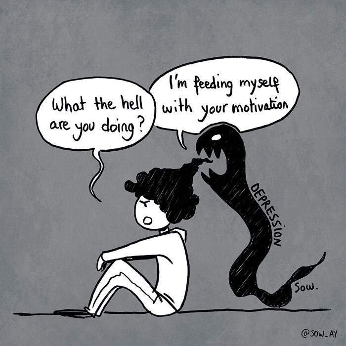 Depresia nu este o gluma. Aceasta "boala a secolului", asa cum este numita, afecteaza milioane de oameni si lasa urme adanci in sufletele lor, chiar daca multi nu isi pot descrie sentimentele si nu stiu ca au fost "atinsi" de ea. Un artist din Franta, cunoscut pe Instagram cu user-ul sow_ay, incearca sa redea exact ce simte cu ajutorul unor ilustratii care, trebuie sa recunoastem, spun mai mult decat 1000 de cuvinte. Iata cateva exemple, in galeria de mai jos (mai multe ilustratii, puteti vedea pe Instagram):