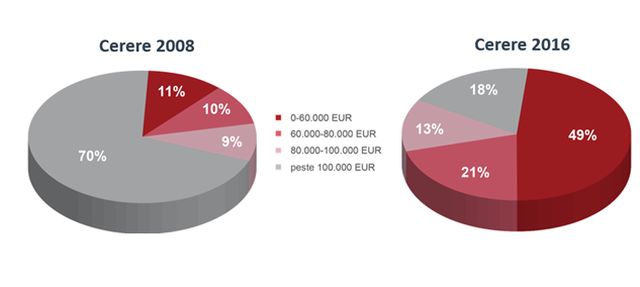 Imobiliare.ro, suma medie solicitata pentru apartamentele (noi si vechi) disponibile spre vanzare la nivel national a scazut cu 41% in primul (aproximativ un) an de recesiune, de la 2.058 de euro pe metru patrat util in momentul de varf al pietei (martie 2008) pana la 1.211 euro pe metru patrat inainte de intrarea in vigoare a initiativei guvernamentale (mai 2009). Ulterior, in perioada 2009-2014, pretentiile proprietarilor s-au mai diminuat, cumulat, cu circa 15% fata de valoarea maxima atinsa inainte de criza, ajungand pana la un nivel minim de putin sub 900 de euro pe metru patrat.