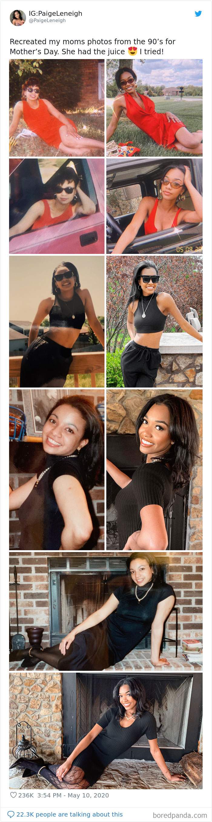 Se spune că imitația este cel mai bun compliment. Mai multe persoane au vrut să aducă un omagiu mamelor, arătând cât de bine le seamănă. Așa că au recreat diferite fotografii din trecut, iar rezultatele sunt fascinante. Mamă și fiică seamănă ca două picături de apă.