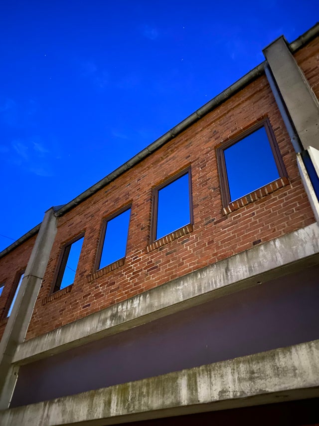 Reflecția din geamuri face să pară că lipsește partea din spate a clădirii