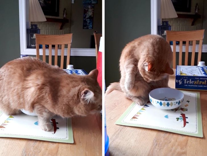 Acestei pisici îi place să bea apă băgându-și burtica în bolul cu apă, apoi linge apa din blăniță