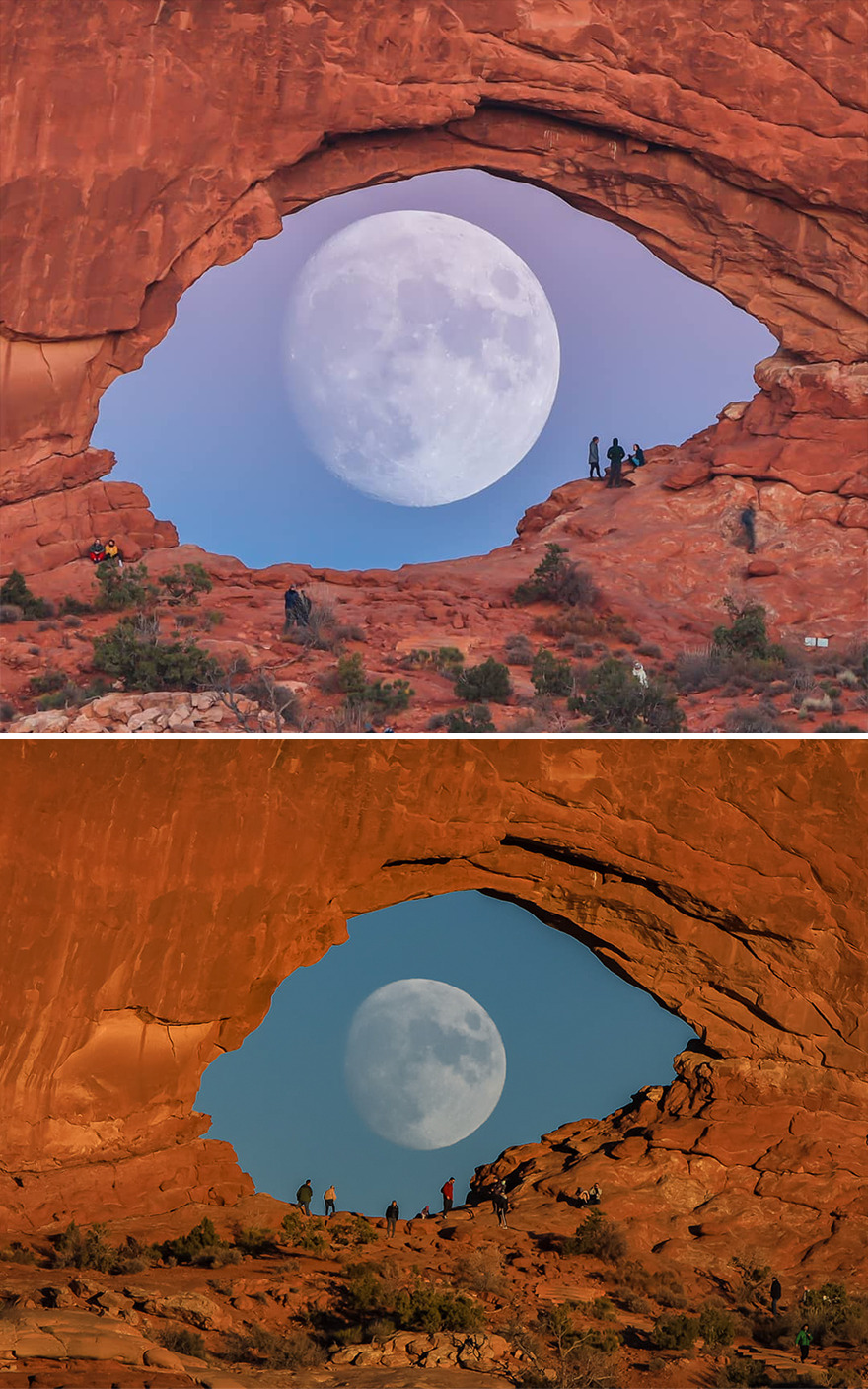 Poate părea greu de crezut, dar imaginile cu luna de mai jos nu sunt create în Photoshop. Fotograful Zach Cooley, autorul acestor imagini, folosește câteva trucuri istețe pentru a face Luna să pară atât de mare. Folosește lentile telemetrice pentru a realizat mai multe fotografii pe care le pune apoi laolaltă într-un singur cadru prin dublă expunere. De aceea Luna din fotografiile sale pare ireal de mare. Mai multe imagini puteți găsi pe pagina de Instagram a lui Zach Cooley.