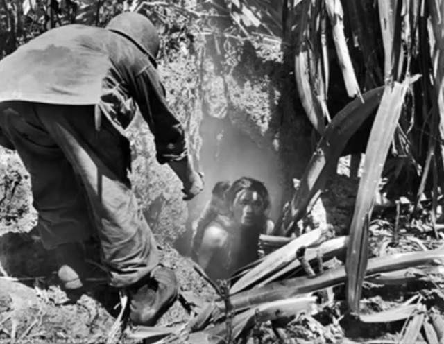 Un soldat american care ofera mana unei femei pentru a parasi pestera in care s-a adapostit, Al Doilea Razboi Mondial