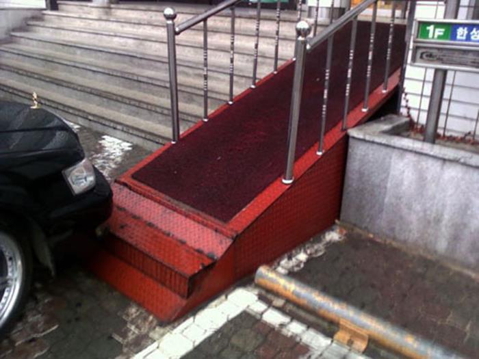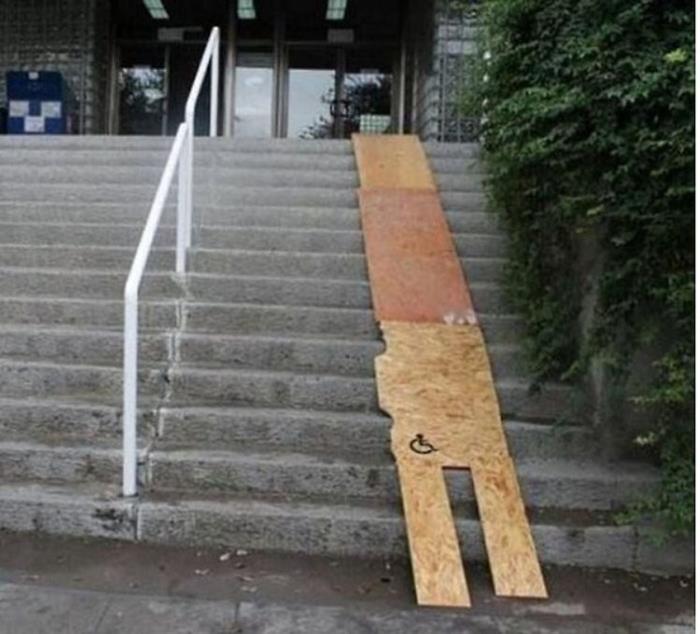 Exista o lege care te cam obliga sa ai rampa pentru scaune cu rotile, insa legea aparent nu spune si cum ar trebui sa fie exact acea rampa, asa ca unii si-au lasat imaginatia sa zburde. Rezultatele le puteti vedea mai jos.