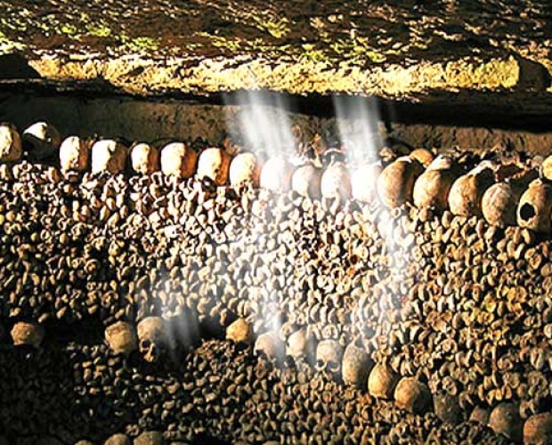 Cu mult timp in urma, cand nu-si mai incapea in porti de cat de inghesuit devenise, Parisul si-a facut rost de pamant dezgropandu-si mortii de secole si depozitandu-i cu milioanele in catacombele din Paris. Oasele lor sunt asezate unele peste altele pe rafturi, brate la brate, picioare la picioare, cranii la cranii, iar unele dintre incaperi au chiar decoratiuni facute din oase disparate.