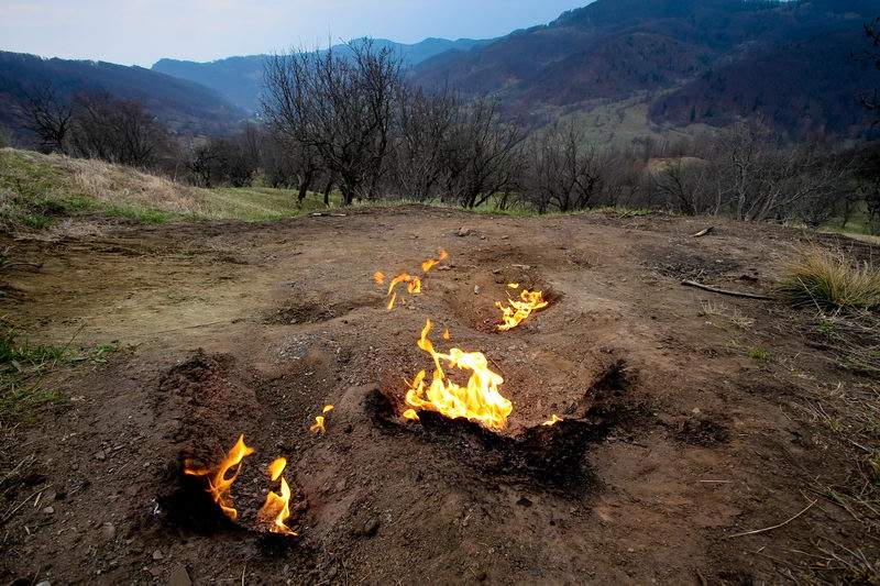 Focul viu este un fenomen natural asemanator Vulcanilor Noroiosi, datorat emanatiei de gaze naturale din pamant si aprinse apoi de oameni, fulgere sau razele soarelui. Le poti gasi in judetul Buzau, in apropierea satului Terca. Daca ziua peisajul nu este foarte spectaculos, pe inserat totul se transforma iar flacarile de culoare galben-rosiatica ofera un spectacol inedit.