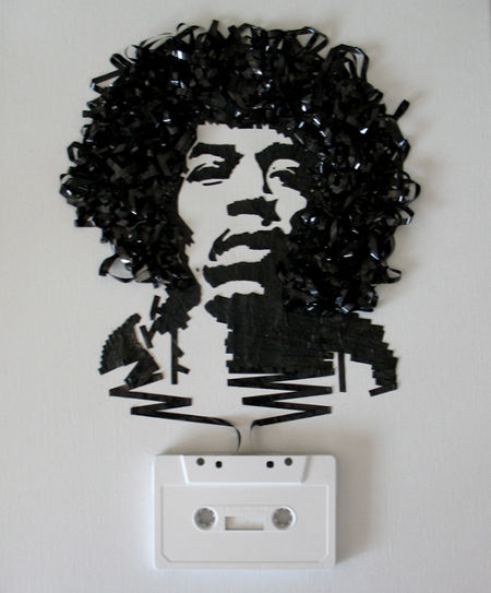 Aceasta este arta simpla, eleganta din… banda unei casete, ca cele de prin anii 1980, tragand toata banda magnetica din carcasa si folosind-o apoi pentru crearea unui portret de artist.