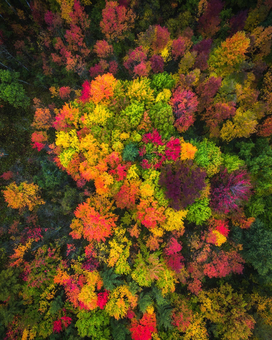 Toamna este un anotimp frumos prin definitie. Da, temperaturile scad, vremea se mai strica, zilele se scurteaza, insa coloritul acestui anotimp este de nedepasit. O toamna superba ne prezinta si Michael Matti intr-un pictorial bun de pus in rama. Locul unde au fost facute fotografiile se afla in partea e nord a Statelor Unite ale Americii, iar pozele au fost facute cu ajutorul unei drone. Setul de fotografii realizat de Michael prezinta toamna dintr-o perspectiva uluitoare. De sus, frunzele multicolore ale copacilor par opere de arta complexe, inedite. Un adevarat festin vizual care trebuie savurat pe indelete.