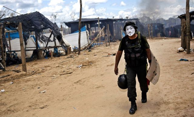 Un politist peruan poarta o masca confiscata dupa raidul din La Palma, regiune Madre de Dios. Peste 1000 de politisti si militari au participat la descinderea care a distrus materiale ilegale de minerit in valoare de peste 3 milioane de dolari.