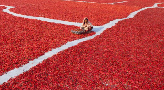 O femeie usuca ardei iute in apropierea raului Jamuna din Bangladesh, mult ardei iute. Acesta reprezinta principala sursa de venituri din regiune si marea majoritate a femeilor fac asta.