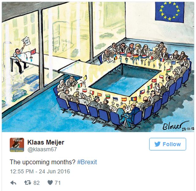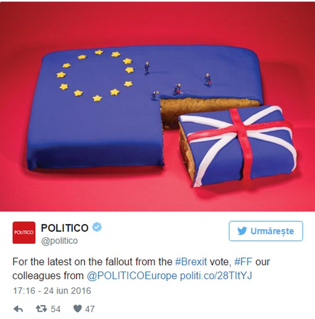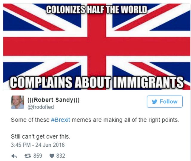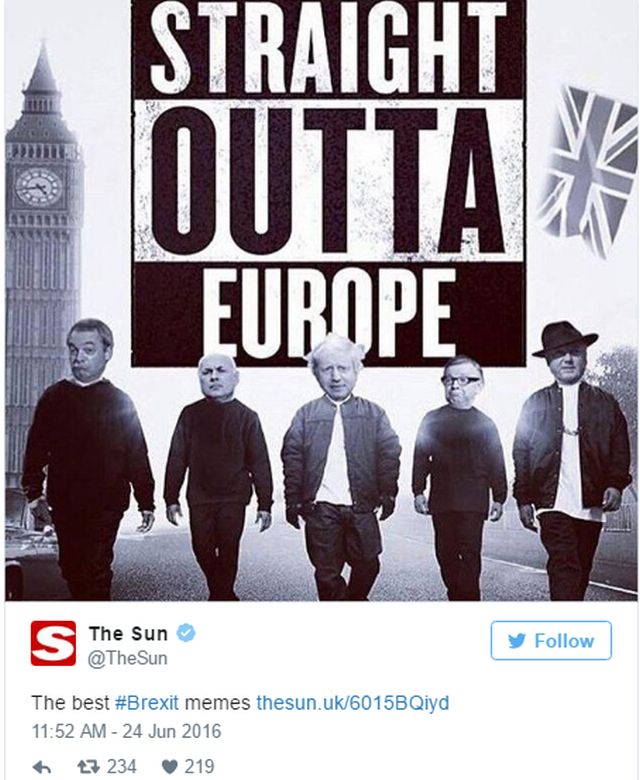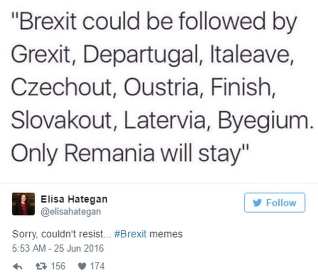 Socul votului populatiei britanice de iesire a tarii lor din spatiul Uniunii Europene a trecut. Cum am fost martorii unui eveniment istoric, internautii nu au putut rata acest moment, iar multi au hotarat sa faca haz de necaz de situatie, de britanici, de populismul liderilor pro-Brexit si nu numai. Mai jos regasiti cele mai amuzante imagini de pe internet, cu si despre Brexit.