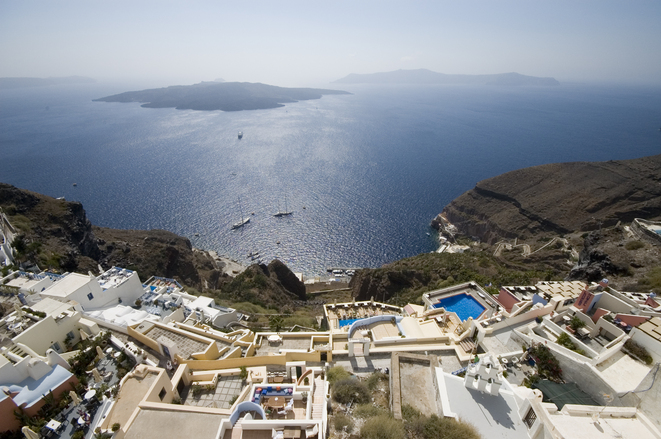 Santorini este formata din 5 insule: Thira, cea turistica, Thirassia (in partea opusa), Nea Kameni, Palea Kameni (insule de lava vulcanica) si Aspronisi (nelocuita), scrie