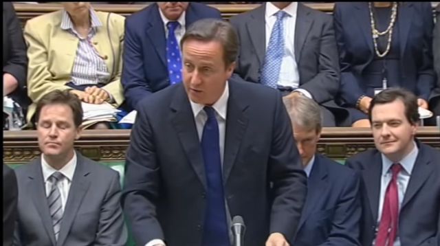 In august 2013, David Cameron a devenit primul premier din ultimii peste 100 de ani care a pierdut un vot in Camera Comunelor privind actiunile militare. A parut o lovitura devastatoare pentru autoritatea sa. El nu a reusit sa convinga suficienti parlamentari, inclusiv conservatori, ca Marea Britanie ar putea sa ia parte la raidurile aeriene impotriva regimului presedintelui sirian Bashar al-Assad. “Cred cu tarie in necesitatea unui raspuns dur privind folosirea armelor chimice, dar cred si in respectarea dorintei Camerei Comunelor”, a spus el la cateva minute dupa anuntarea rezultatului votului.