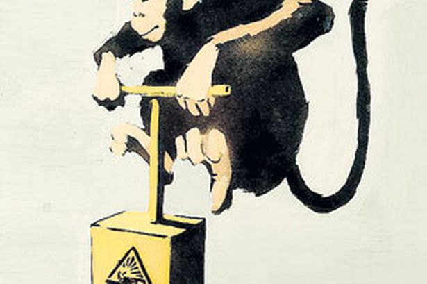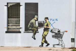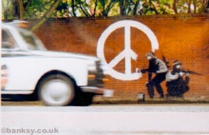Lui Banksy ii plac juxtapunerile de imagini contradictorii pentru a face o declaratie politica. Logoul CDN (Campania pentru Dezarmare Nucleara) este universal recunoscut ca simbol al pacii. Aceasta este o alta imagine, ce a fost inlaturata.